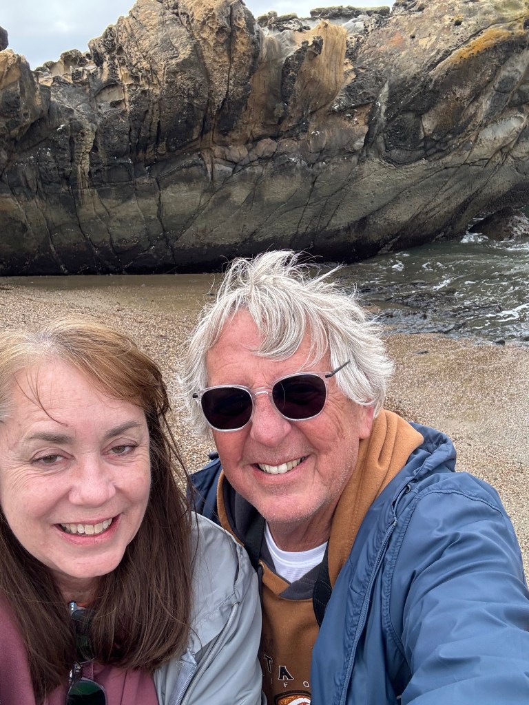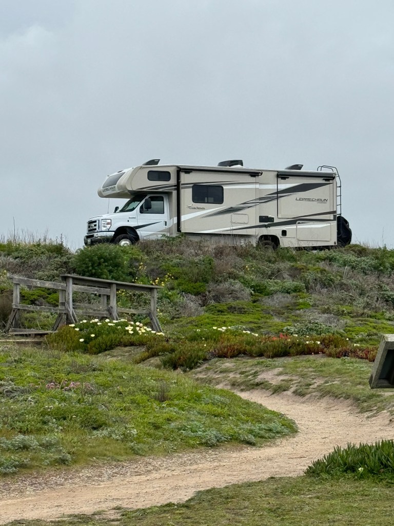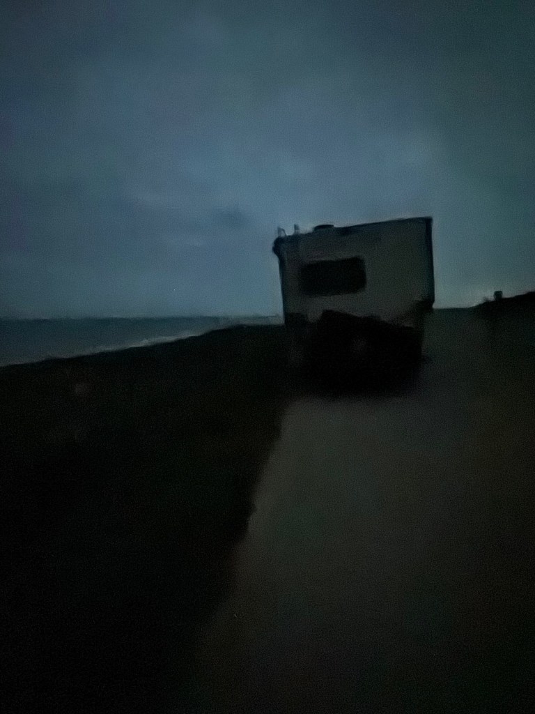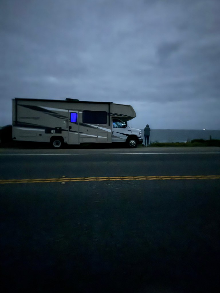 It was one am when we finally reached the west coast, Pacific side. Somehow, this one escaped us until I reflected on it. Perhaps because we were new at RVing or just so worn from the drive, we had no plan but to find anywhere we could be legal and safe. At one a.m., we drove north on the PCH for about thirty miles. We turned back to Santa Cruz down the PCH again; it was dark, foggy, and cool, with ocean air blowing west to east. The waves made sounds I’d never heard the ocean make before: the water crashed on the rocks and cliff sides below, making a hollow, echoing roar with a swish, fading with another crash before the first faded. Over and over, Sherrie, we have to find a place to stop. She had been quietly on the computer navigation system, satellite-driven, of course. She said in the dark to me as I eased down the PCH, “Slow down a bit, there’s something on the right coming up.” “What did I reply?” she told me she was looking over a mapping of the roads database from the Road Trippers app, and she said, “You’ve passed this already, northbound.” “Past what?” I said again.