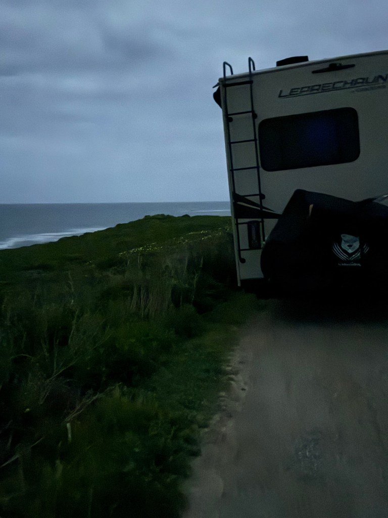 “Ok, in about a mile on the ocean side, there is a gravel pull-off, no restrictions, and it is public domain,” she was eager to locate it. With the old dim headlights that we decided to run to California with, barely lit up the road, unlike the ones we use now. She kept her eye on the map, saying slow, slow, slow. I was down to 20 mph by now, no traffic, no cars, just sky, the cliffs, and ocean with the roaring. I somehow felt this may be it.